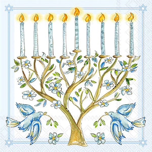 Light up your celebration with these delightful cocktail napkins showcasing a stunning watercoloUr menorah surrounded by blooming branches and graceful doves in soothing shades of blue and gold. Perfect for adding a touch of meaningful elegance to holiday gatherings, they're soft enough to cradle delicate appetizers yet sturdy enough for confident sipping. Measuring 5 x 5 inches, these German-printed 3-ply napkins bring artistic beauty and festive spirit to every toast and treat.