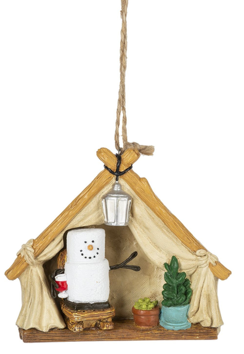 Smores camping ornament with lantern, plants, and a drink in the tent!
