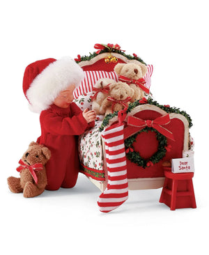 A cozy companion for the holiday season, this charming 2-piece set features adorable Clothtique fabric pieces snuggling up before Santa's big arrival. Soft plush bears and bedding details capture that magical anticipation of Christmas Eve, making it an enchanting addition to any Possible Dreams Santa collection.