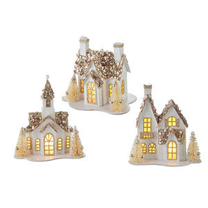Something gold is a must have during the holidays, add one or all three of these stunning ornaments to your tree! Each one features a white building with a roof encrusted in gold glitter and sequins! Each window is trimmed in gold glitter and a pair of bottle brush trees sit outside each door! Requires 3 Lr44 Batteries, not included.